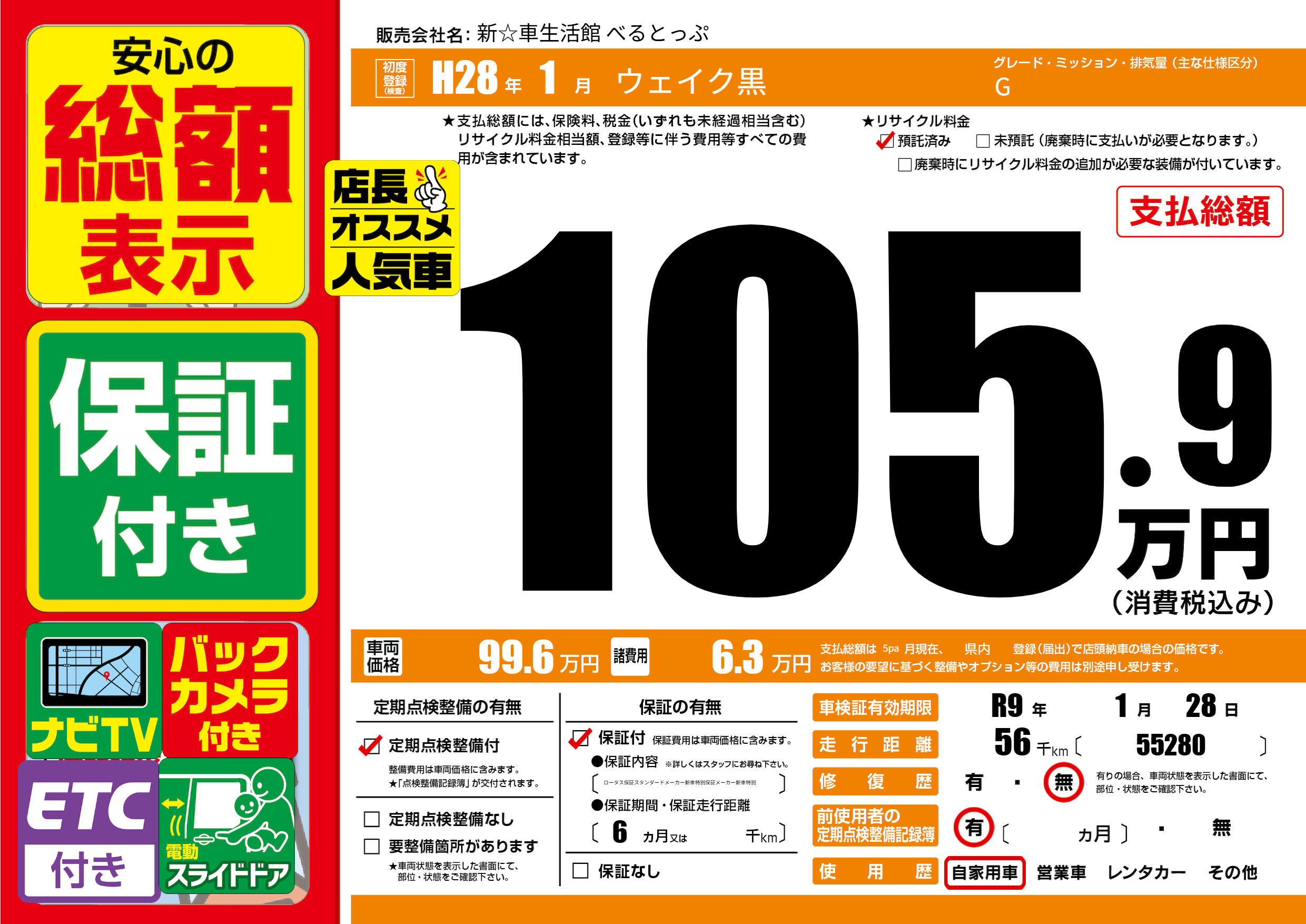 | 走行キロ | 5.6万km | 初年度登録 | H28年1月 |