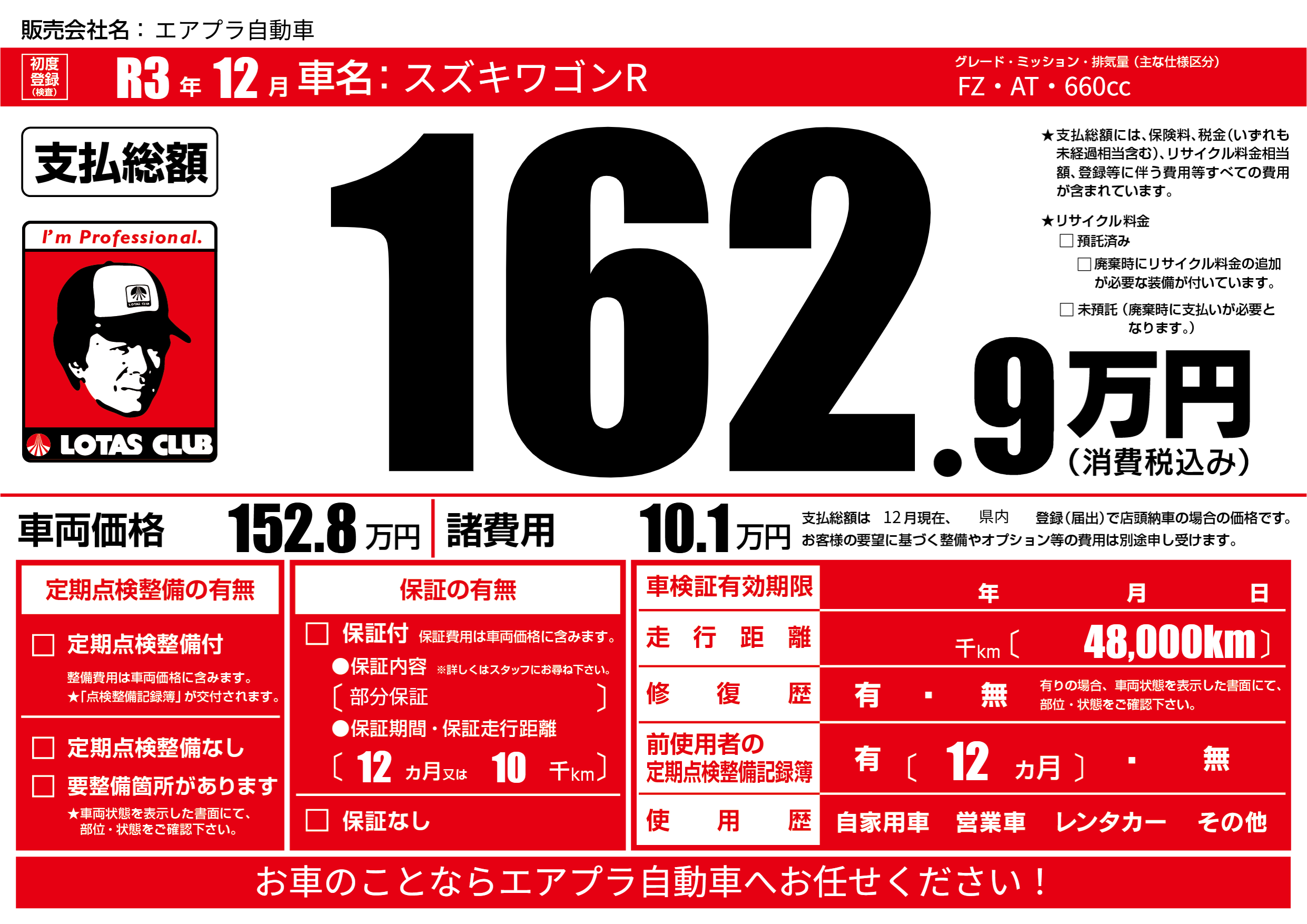 保証なし 保証内容(部分保証) 12ヶ月または(10)千kmまで |